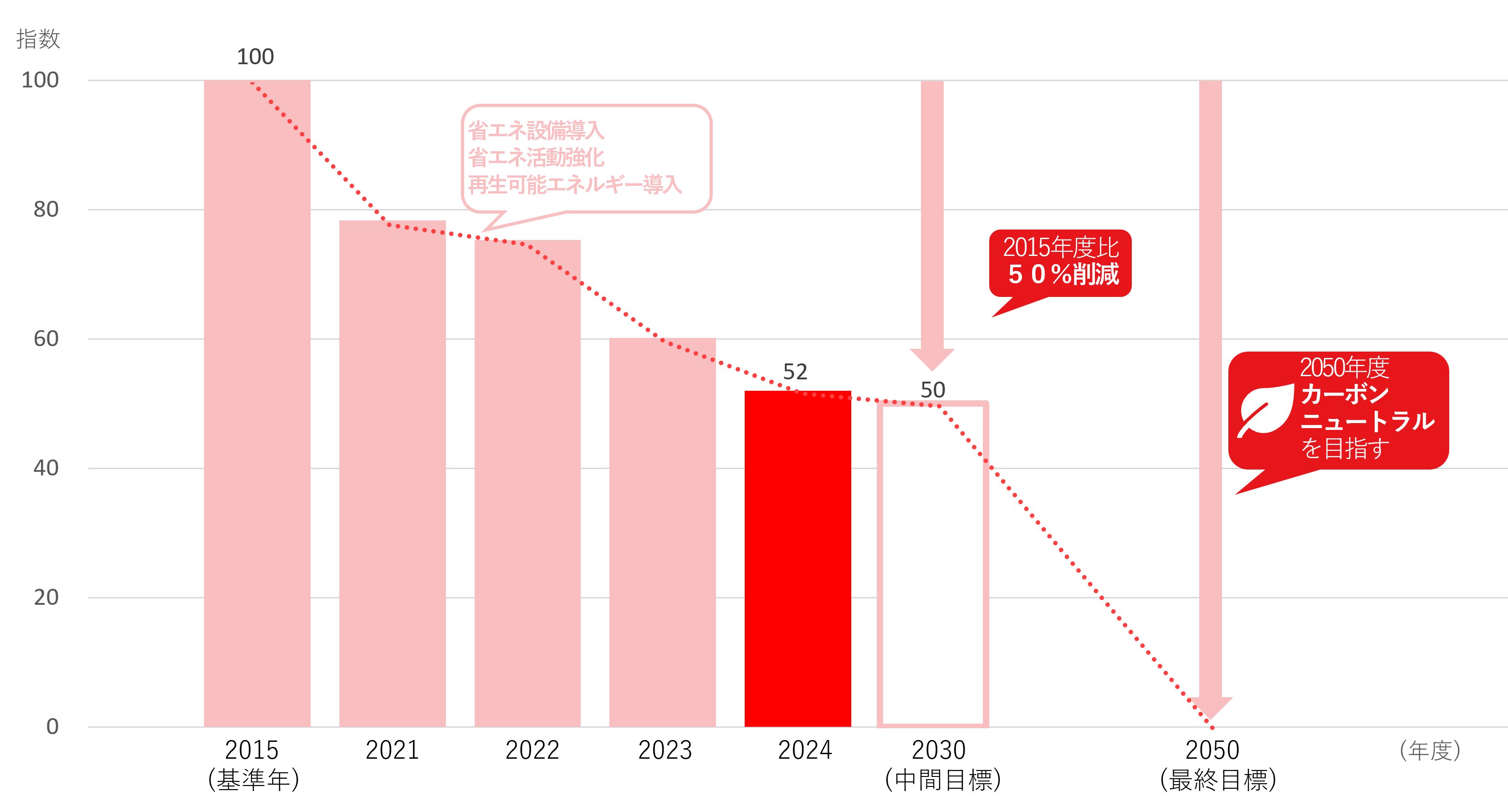 CO₂排出量については、2030年度までに△50%(2015年度比)、2050年度にはカーボンニュートラルの達成の目標を掲げ、活動を推進しています。